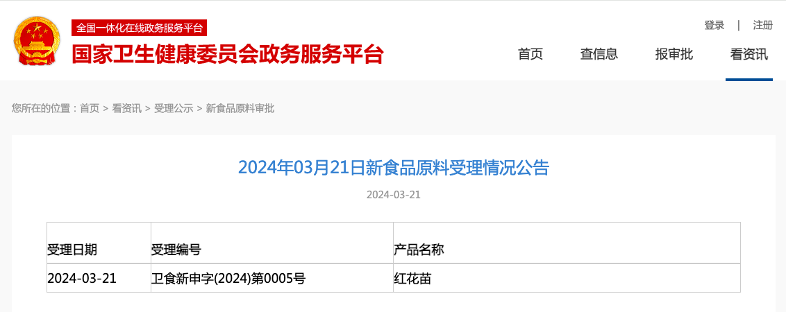 2024年3月21日,企業(yè)委托我司申報(bào)的“紅花苗”已正式獲得國家衛(wèi)健委的受理,受理編號:衛(wèi)食新申字(2024)第0005號。整個申報(bào)過程歷時1年多,經(jīng)歷了前期審議、樣品檢驗(yàn)(包括成分分析、衛(wèi)生學(xué)、毒理學(xué)及安全性評估等)、材料遞交以及形式審查等環(huán)節(jié)。接下來,我們將按照國家衛(wèi)健委的要求進(jìn)行技術(shù)評審、現(xiàn)場答辯并補(bǔ)充必要的意見,全力以赴推進(jìn)項(xiàng)目申報(bào)進(jìn)程。