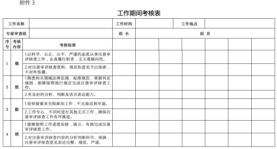 第十九條 食審中心通過工作期間考核表(附件3)對專家在參與注冊審評核查工作期間的履職情況進(jìn)行考核;在專家未參與注冊審評核查工作期間,食審中心發(fā)現(xiàn)的其注冊審評核查意見有誤、違規(guī)違紀(jì)等情況,通過非工作期間考核表(附件4)進(jìn)行考核。