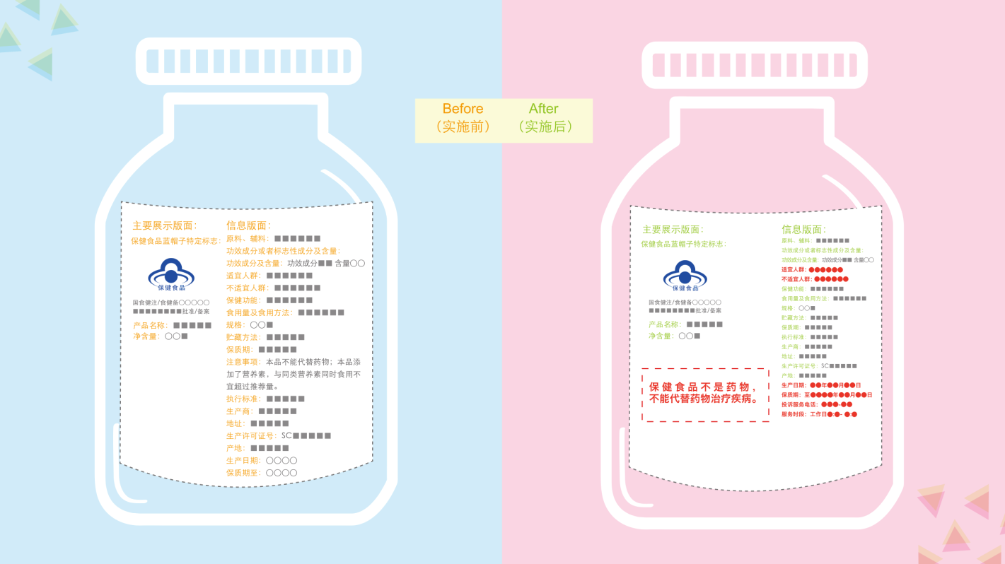 保健食品標(biāo)簽設(shè)置警示用語(yǔ)區(qū)及警示用語(yǔ)。警示用語(yǔ)區(qū)位于最小銷售包裝包裝物(容器)的主要展示版面,所占面積不應(yīng)小于其所在面的20%。警示用語(yǔ)區(qū)內(nèi)文字與警示用語(yǔ)區(qū)背景有明顯色差。警示用語(yǔ)使用黑體字印刷,包括以下內(nèi)容: