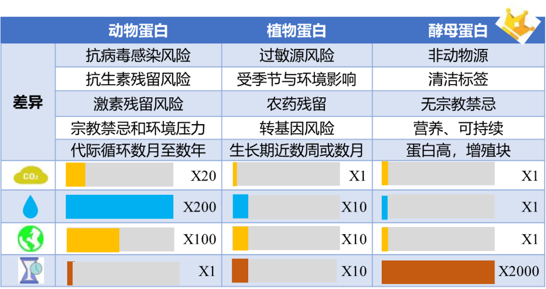 此外,酵母蛋白是非動(dòng)物源蛋白,其在抗病毒感染、過敏性、抗生素殘留、轉(zhuǎn)基因風(fēng)險(xiǎn),以及宗教禁忌等方面,均顯現(xiàn)出比動(dòng)物和植物蛋白更明顯的優(yōu)勢(shì)。